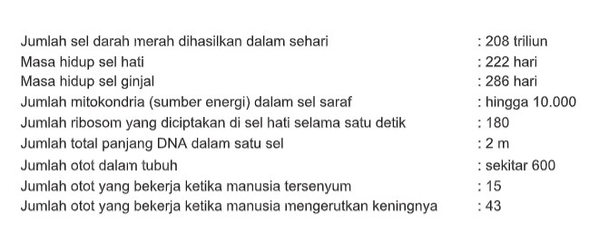 Alasan mengapa aku memberikan semua angka ini bukanlah semata-mata ingin menunjukkan padamu tentang banyaknya sel, organ, dan jaringan yang Kau punya. Akan tetapi adalah untuk menekankan padamu bahwa Allah mampu menciptakan semua ini dengan ketelitian yang sama ketika Ia menciptakan satu buah sel. Hewan mamalia juga memiliki organ dan jaringan seperti yang telah aku sebutkan di atas. Namun beberapa mamalia memiliki organ berbeda dengan aspek keunggulan yang berbeda pula. Maka, dari sudut pandang ini sebenarnya kita tidaklah jauh berbeda dari sapi maupun kuda. Meski demikian, Allah berfirman bahwa Ia menciptakan kita dalam bentuk yang paling indah dan paling sempurna, melengkapi kita dengan kualitas yang unggul, dan memberikan kita kekuasaan atas semua makhluk lain.