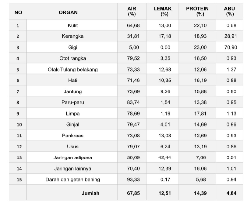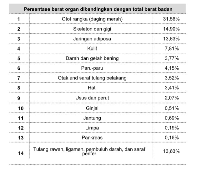 Pengetahuan seperti ini pada akhirnya hanya akan menjadi tumpukan pengetahuan yang tidak berharga dan bermakna. Sekarang, kita akan melihat tubuh manusia secara statistiknya. Maka nikmatilah pelajaran terakhirmu ini Budi, baru kemudian setelah ini kita bisa mengucapkan salam perpisahan. Sebelum kita berbincang tentang sistem dan organ-organ yang membentuk tubuhmu, terlebih dahulu perlu Kau ketahui bahwa adalah sebuah anugerah ketika Tuhan tidak membiarkanmu dalam ketiadaan, sebaliknya Ia justru menempatkanmu dalam keberadaan. Lalu Kau pun harus tahu bahwa Ia tidak membiarkanmu menjadi sebuah molekul anorganik, sebaliknya justru menciptakanmu sebagai organisme hidup, ini adalah sebuah anugerah. Untuk membuatmu memahaminya lebih baik, aku akan memintamu melihat dengan hati-hati pada perhitungan yang sangat halus pada angka-angka yang akan kuberikan padamu dalam tabel berikut dan agar Kau menyadari betapa tingginya nilai dirimu yang telah diangkat oleh-Nya. Berat dan persentase elemen anorganik dalam tubuh manusia yang berbobot 70 kg: